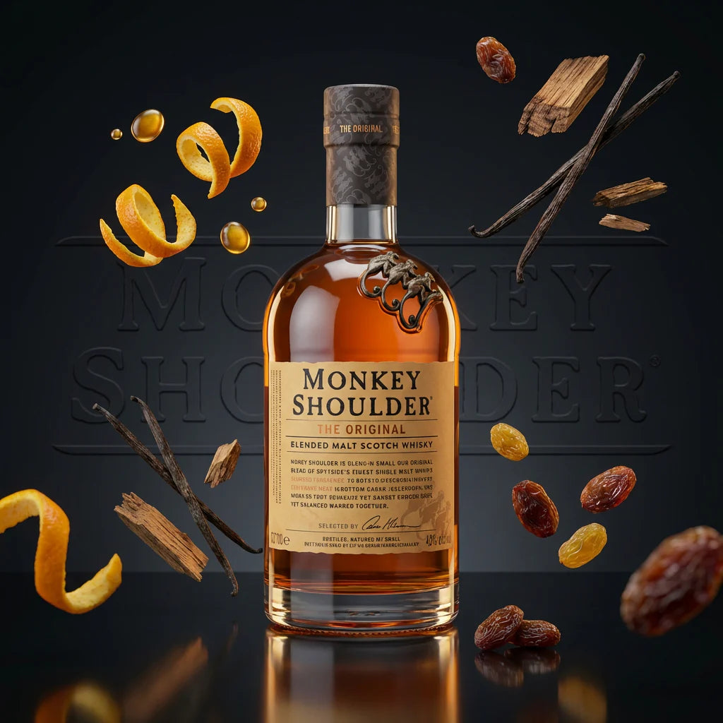 Tasting notes: Orange zest, vanilla, spices and malt. Crafted from a blend of Speyside malts, Monkey Shoulder bursts with fresh citrus and warming spice. A playful, modern Scotch perfect for mixing or enjoying neat with friends.